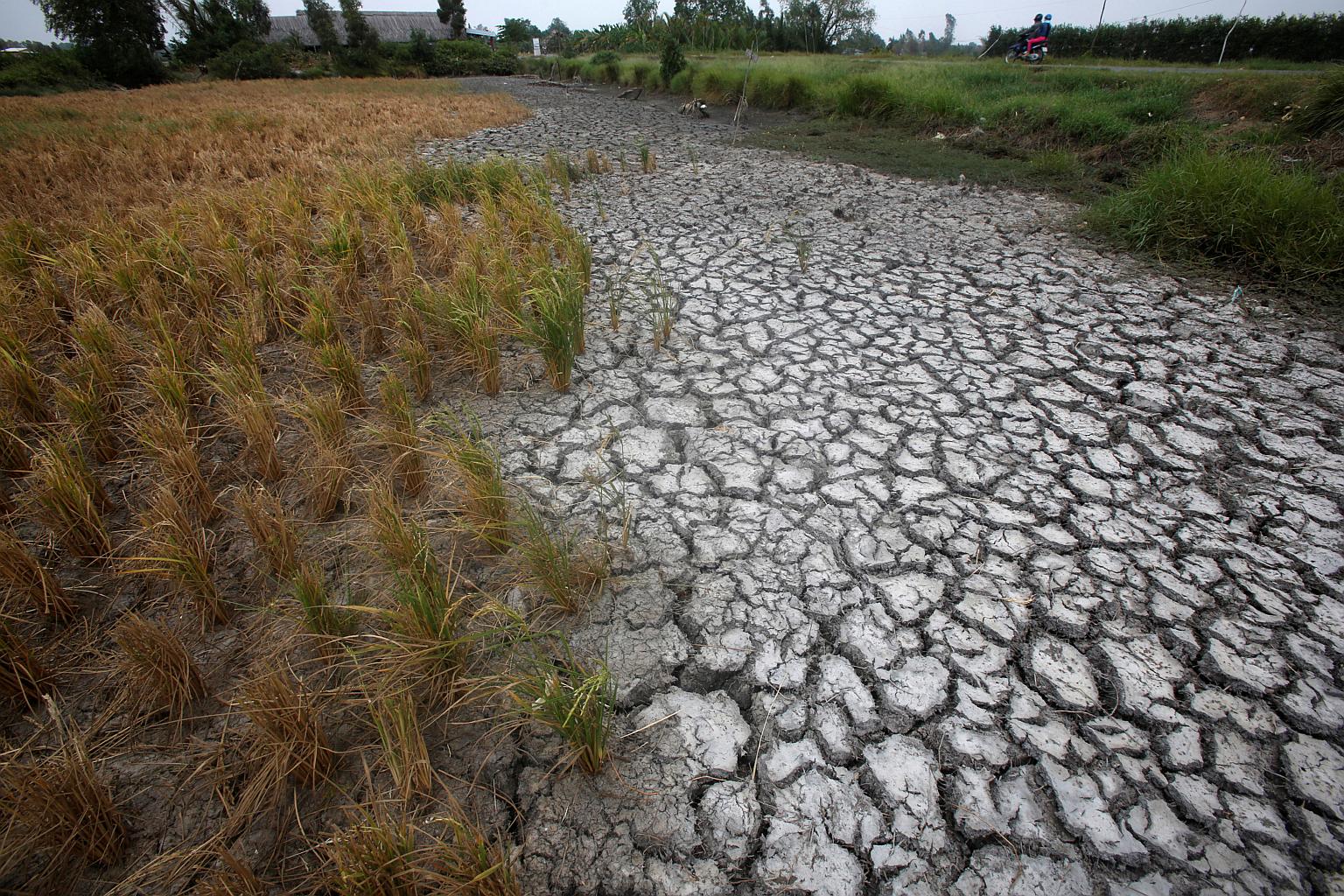 Dried-up rice is seen on a paddy field stricken by drought in the Mekong Delta in Vietnam.