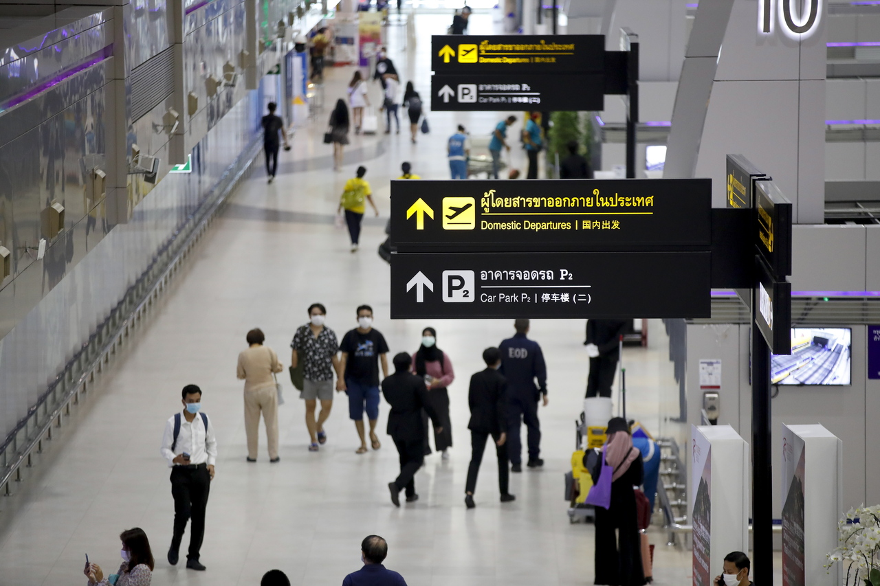 People walk inside the domestic departures terminal at Don Mueang airport in Bangkok on May 1, 2020.