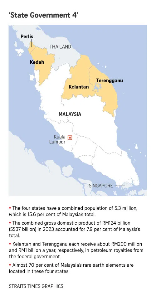 The four states have a combined population of 5.3 million, or 15.6 per cent, of Malaysia’s total population. They are among the poorest of Malaysia’s 13 states, with a combined gross domestic product (GDP) of RM124 billion in 2023, or just 7.9 per cent of Malaysia’s total GDP.