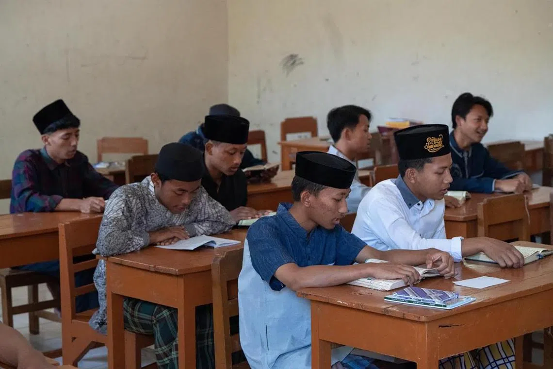 A religious teacher at JI-linked Pesantren Darusy Syahadah supervising students as they recite Quranic verses on Sept 13.