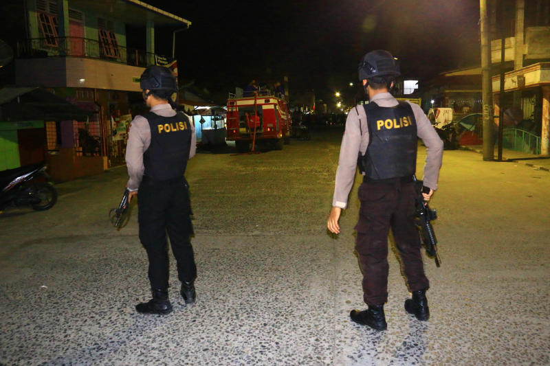 Police stand guard outside the besieged house of Indonesian militant Husain alias Abu Hamzah, in Sibolga, North Sumatra province, on March 12, 2019, after an explosion injured officers.