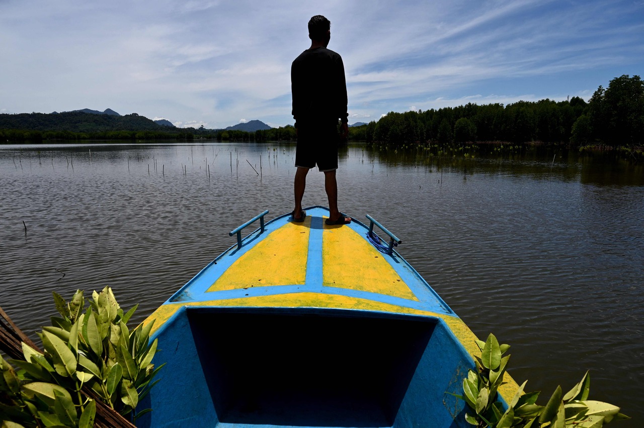 In this photo taken on Sept 19, 2021, a volunteer from the Ecological Observation and Wetlands Conservation collect plastic waste from a mangrove swamp in Surabaya.