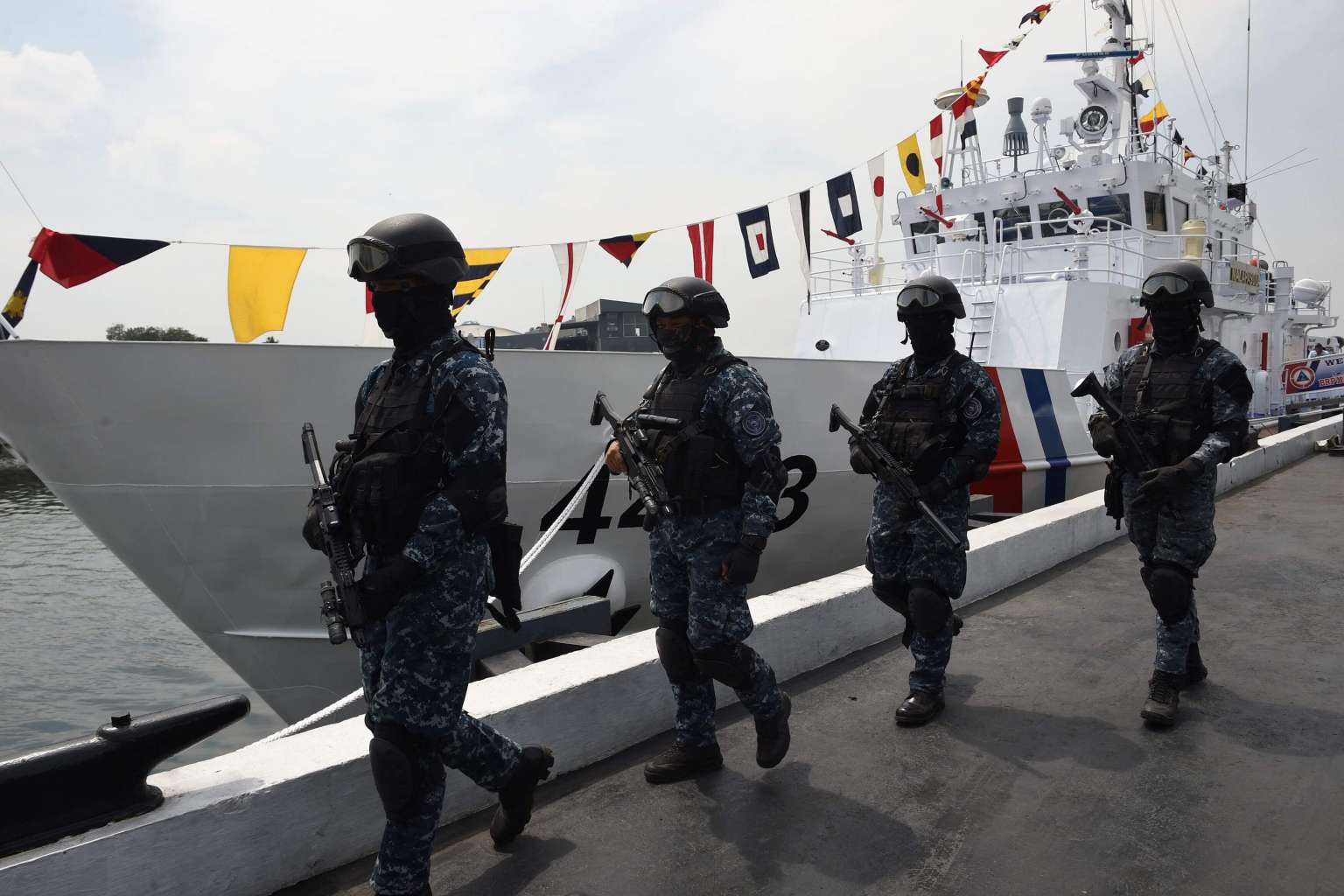 Members of Philippine coast guard anti-terrorism unit stand next to the newly commissioned coast guard's Multi-Role Response Vessel (MRRV) BRP Malapascua during a ceremony at the coast guard headquarters in Manila on March 7, 2017.