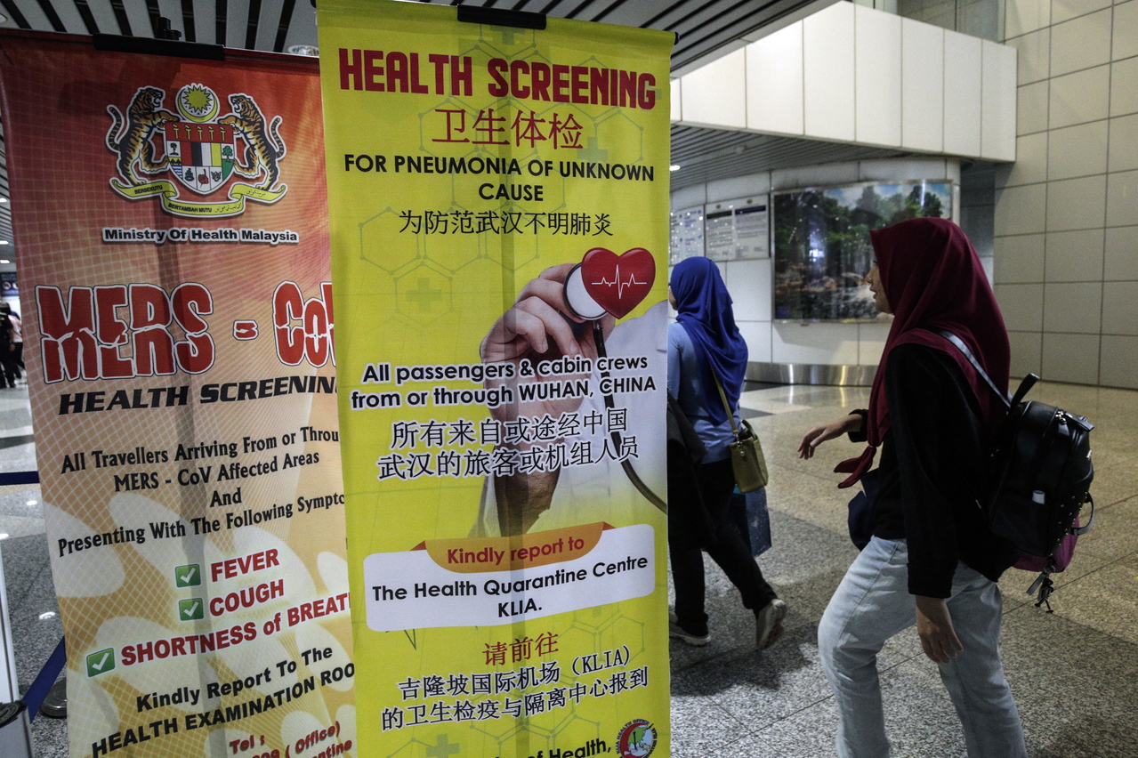 Passengers walking past a poster about coronavirus screening at the Kuala Lumpur International Airport in Sepang, Malaysia, on Jan 21, 2020.