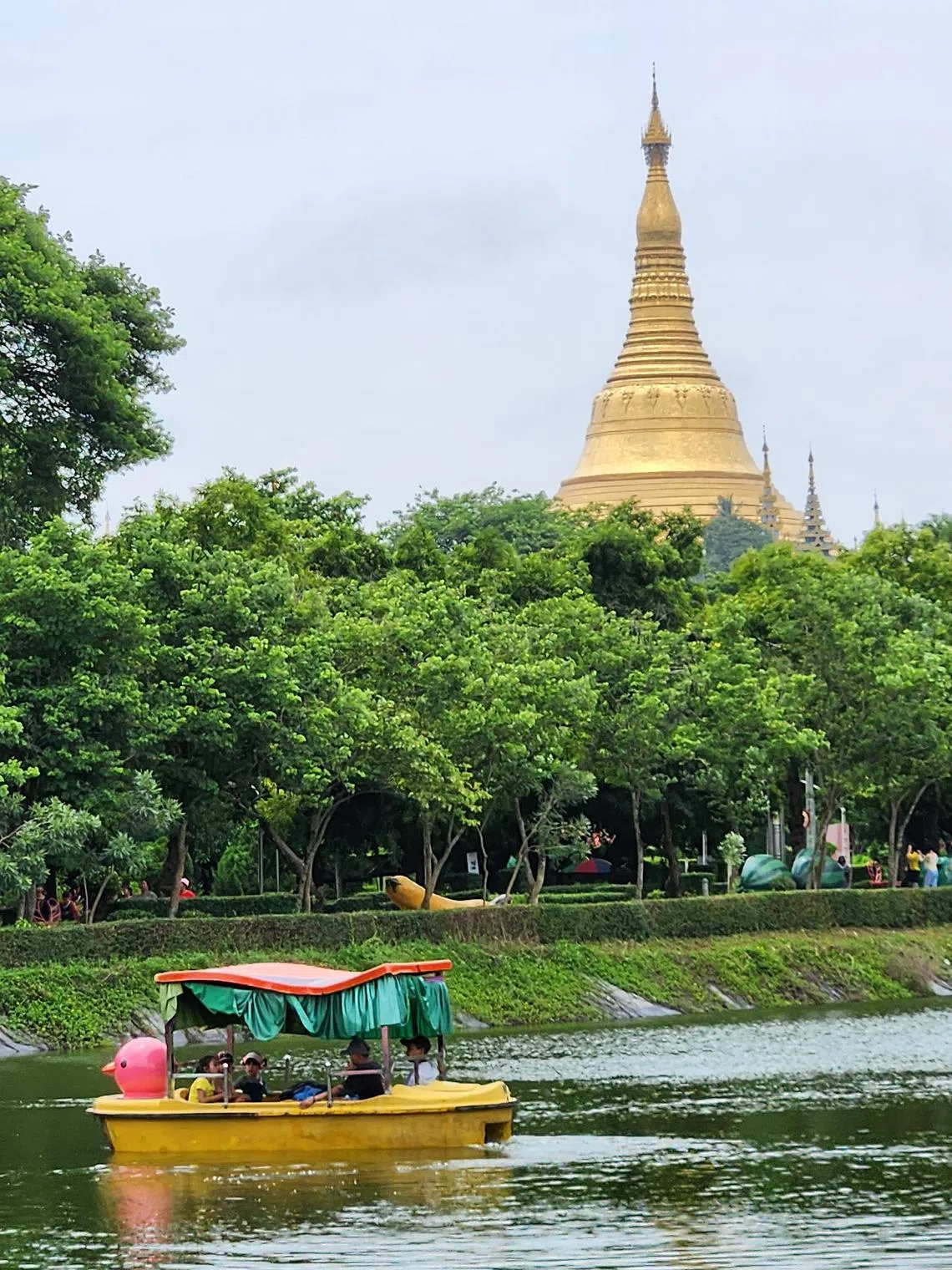A boat at People’s Park in Yangon in June 2024 with the Shwedagon Pagoda in the background.