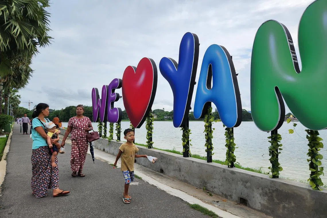 Yangon residents on a footpath by Inya Lake during a weekend in June 2024.