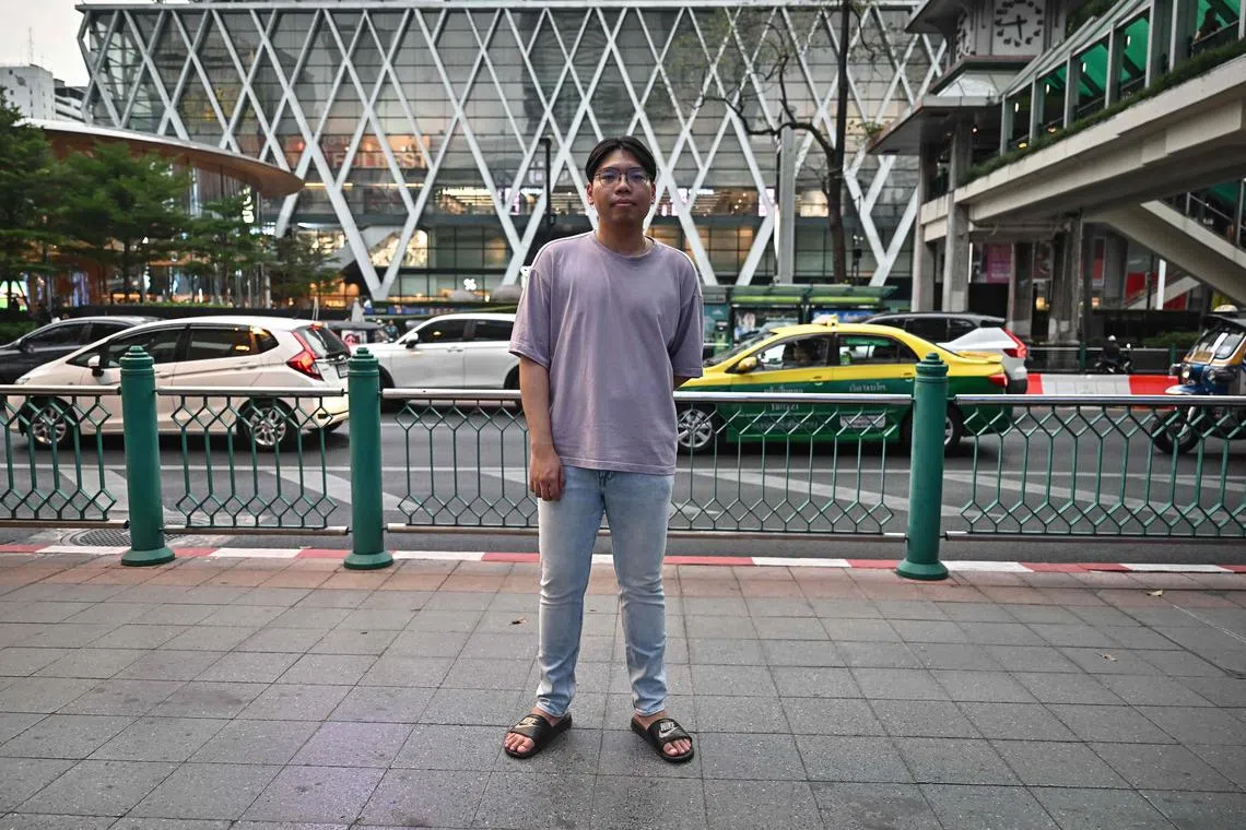 Technology analyst Noppakorn “Nine” Sakkamart posing for a photo at Ratchaprasong, where he previously attended protests in 2020, in Bangkok.
