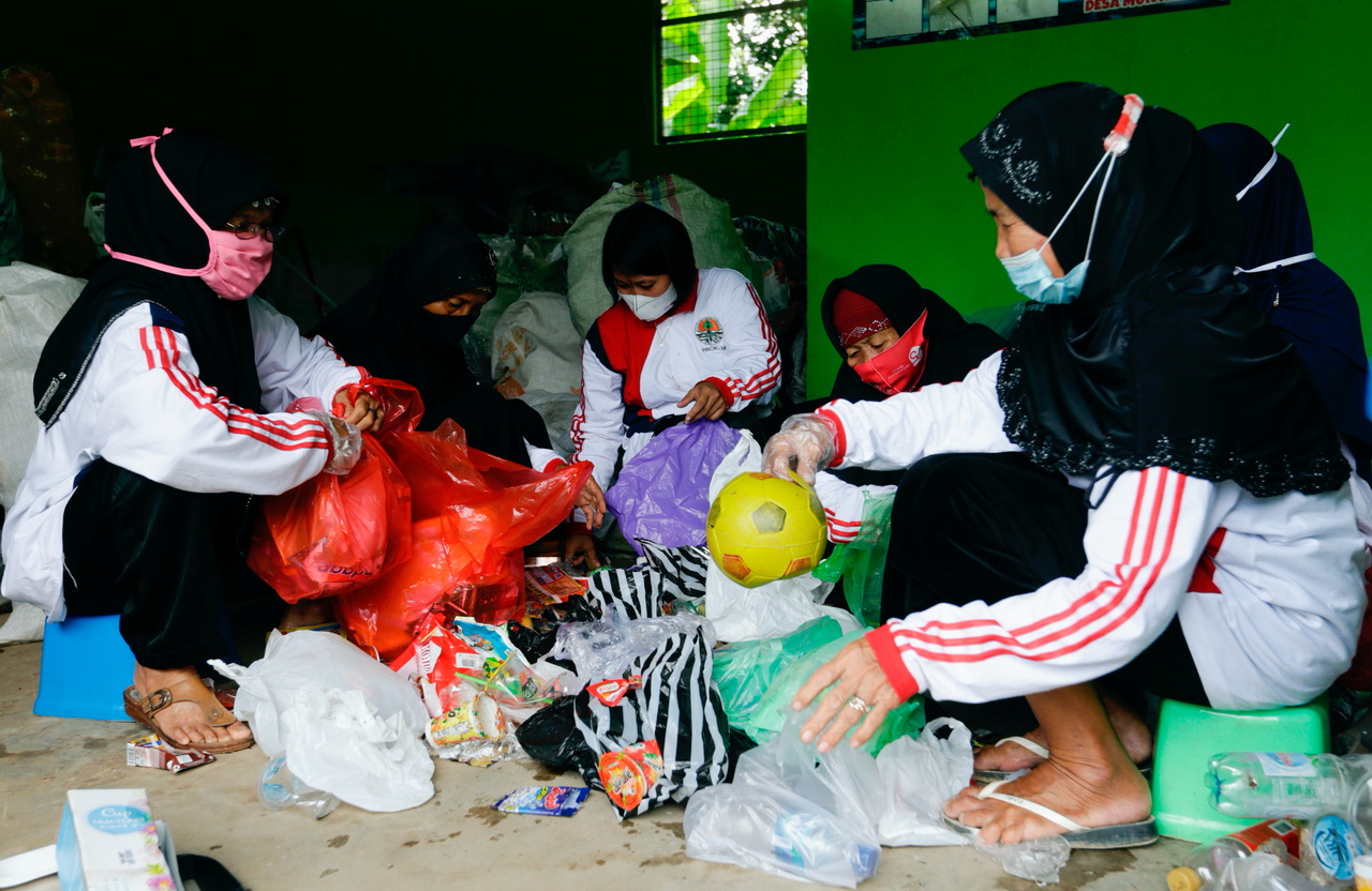 Volunteers sort plastic waste at a trash bank in Muntang village, Central Java on Nov 2, 2021.