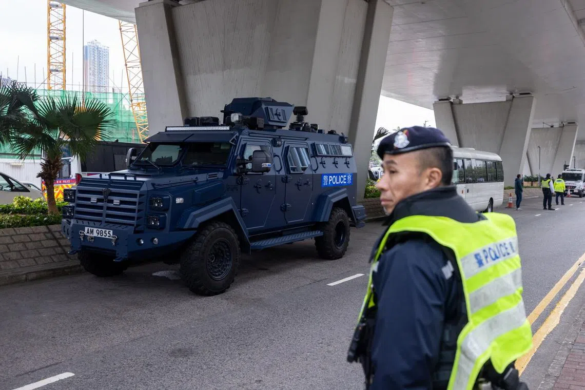 Police outside the West Kowloon Magistrates’ Courts ahead of a hearing for Jimmy Lai in Hong Kong on Dec 18.