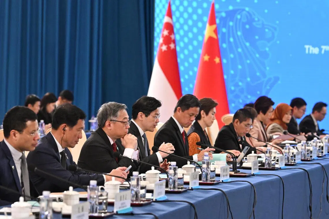 Members of the Singapore delegation, led by DPM Lawrence Wong (fourth from left), hold their first in-person meeting with Chinese leaders at the JCBC and Joint Steering Council meetings.