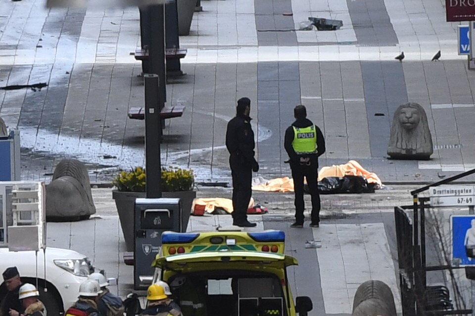 The bodies of victims covered by blankets on the ground in central Stockholm after a truck crashed into a department store in central Stockholm, Sweden, on April 7, 2017.