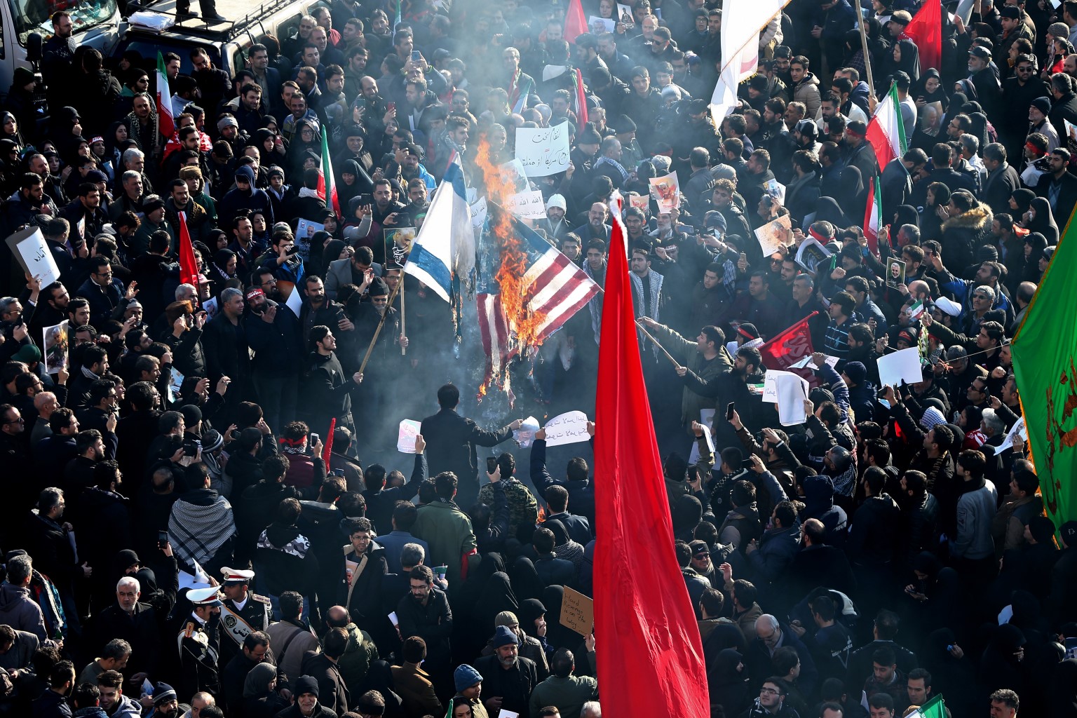 Iranians burning American and Israeli flags during the funeral procession for Iran’s Major-General Qassem Soleimani, head of the elite Quds Force, who was killed by the US in an air strike in Baghdad on Jan 3. PHOTO: REUTERS