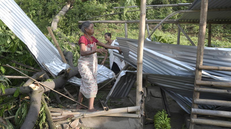Indian women remove the tin sheets from their houses which was destroyed by strong winds and thunder storm, on the outskirts of Guwahati, Assam, India, May 9, 2018.