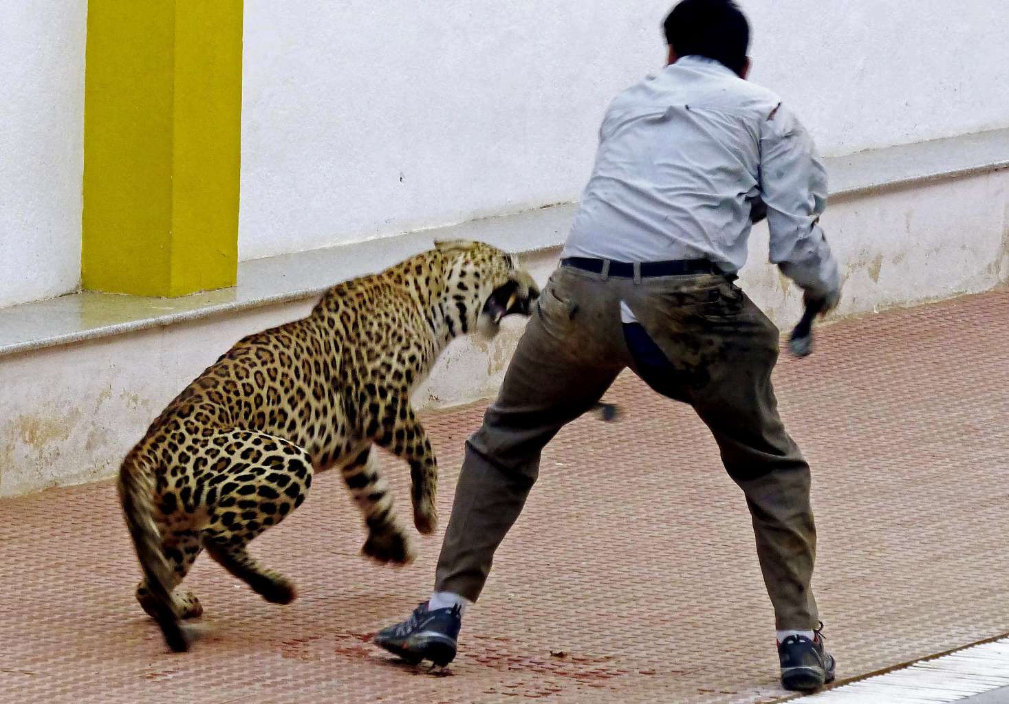 A leopard attacking a forest official at a school in Bangalore, India, on Feb 7, 2016.