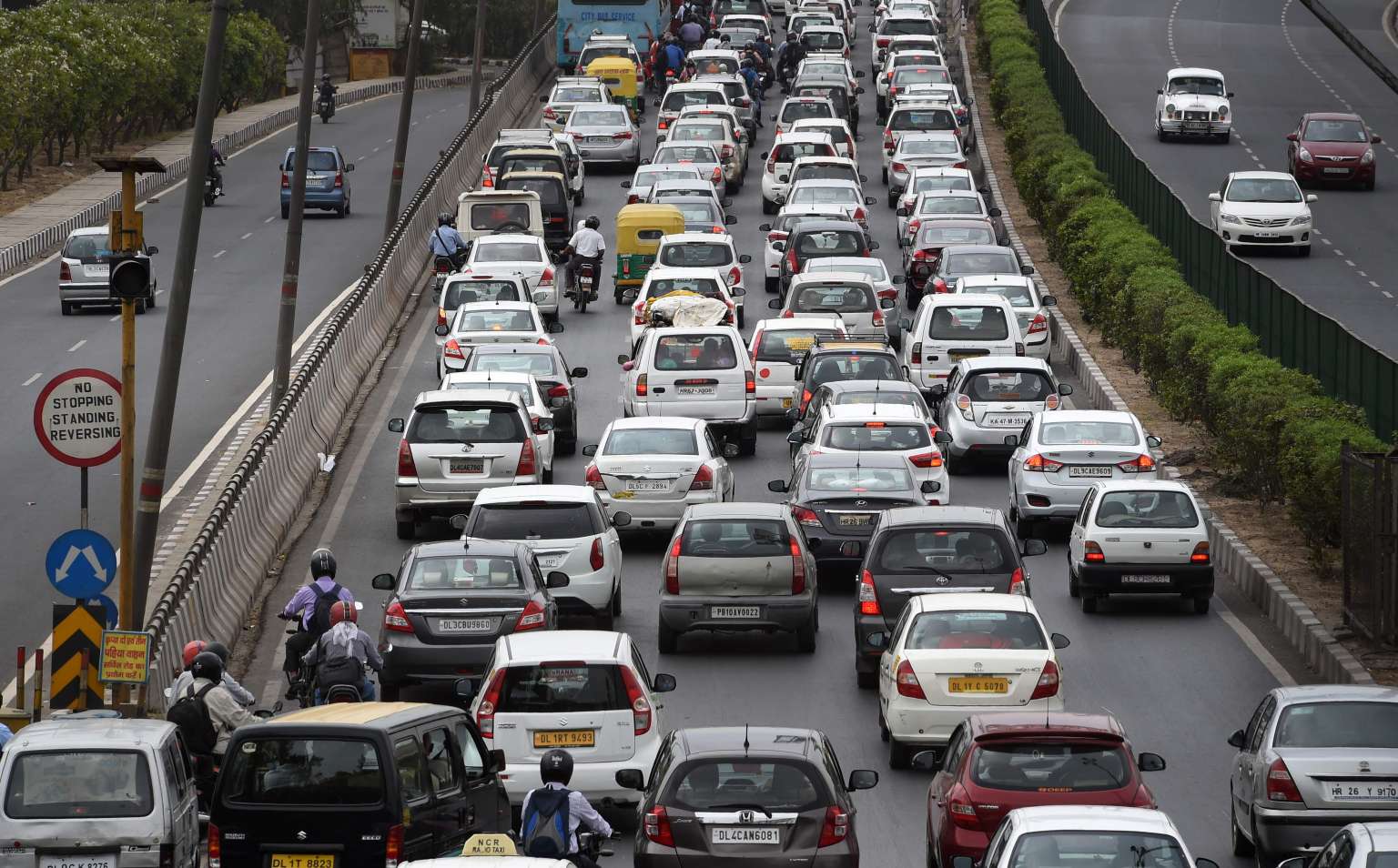 Indian commuters travel in a traffic jam on their way to Gurgaon from New Delhi on May 3, 2016.