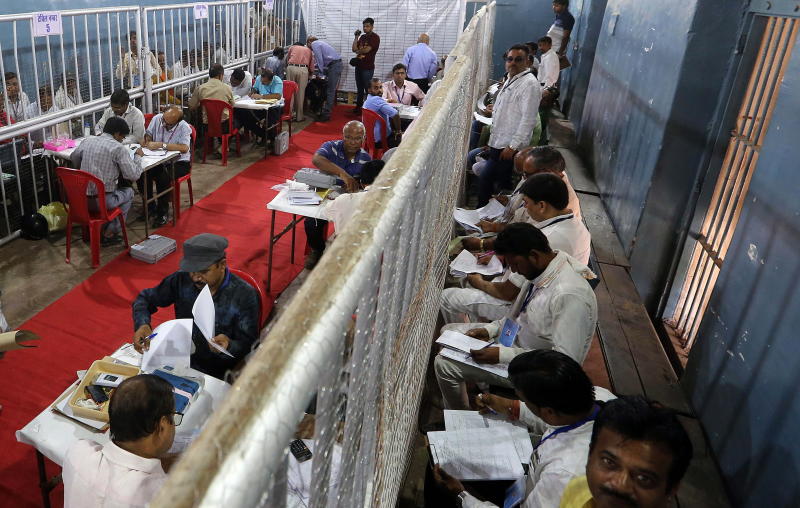 Election officials tally ballots for the Lok Sabha election in Bhopal, India, on May 23, 2019. Indian laws bar people from contesting an election if they have been convicted while in office for crimes that carry jail terms of two or more years.