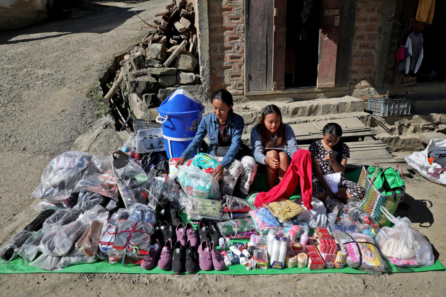 Mah Tial's daughters sell goods at a roadside stall at Farkawn village near the India-Myanmar border on Nov 22, 2021.