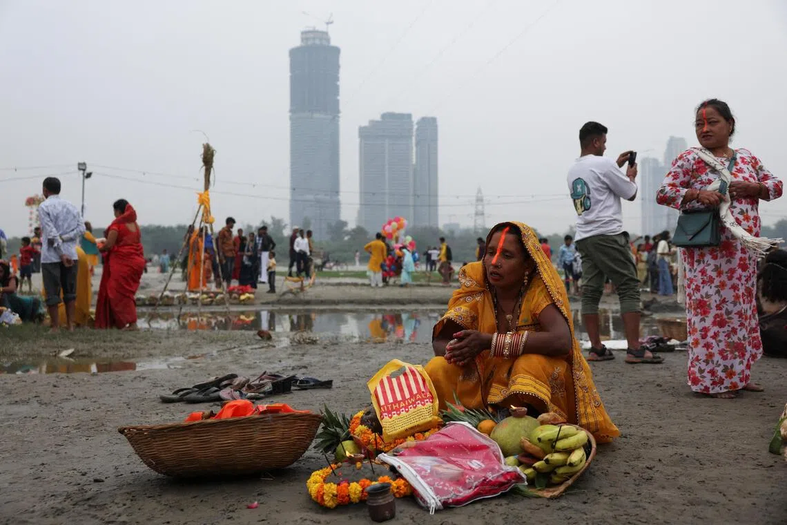 Hindu devotees offering prayers to the sun god Surya in the Yamuna river in New Delhi on Oct 27.