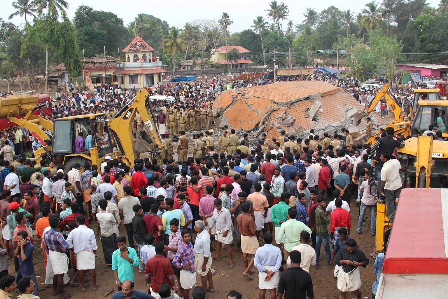 People gather at the spot where a fire triggered by fireworks resulted in an explosion and a roof collapse at a temple in Kollam, India, on April 10, 2016.