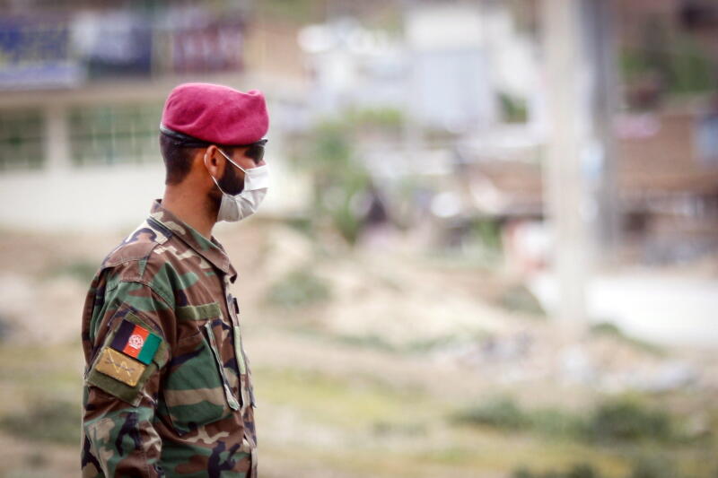 An Afghan security officer stands guard in the outskirts of Kabul.