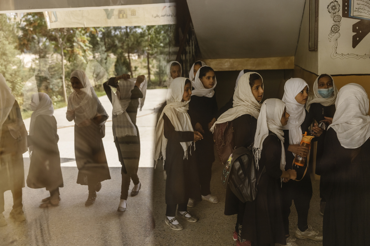 Girls waiting to go to class at a school in Kabul on Sept 15, 2021.