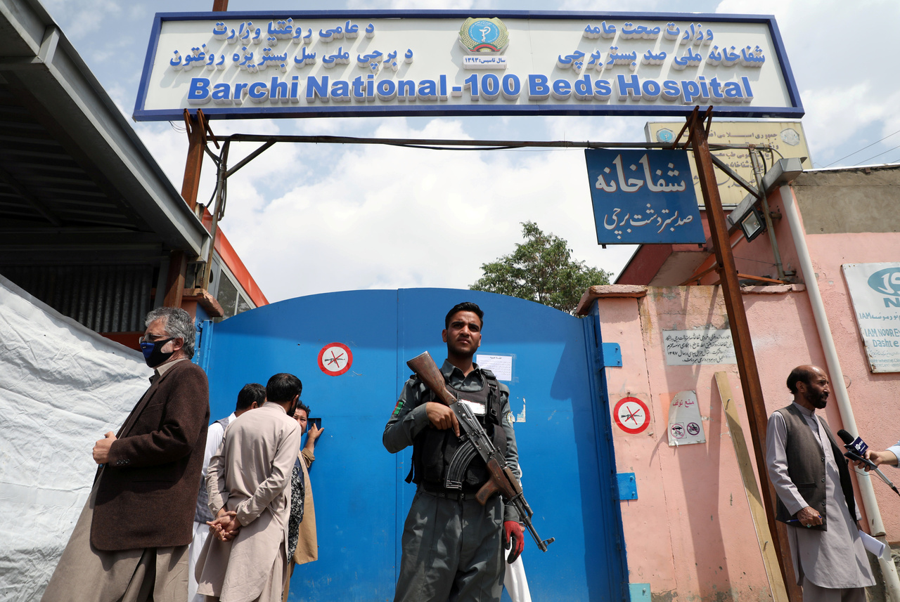 An Afghan police officer is seen guarding the Barchi National Hospital in Kabul on May 13, 2020.