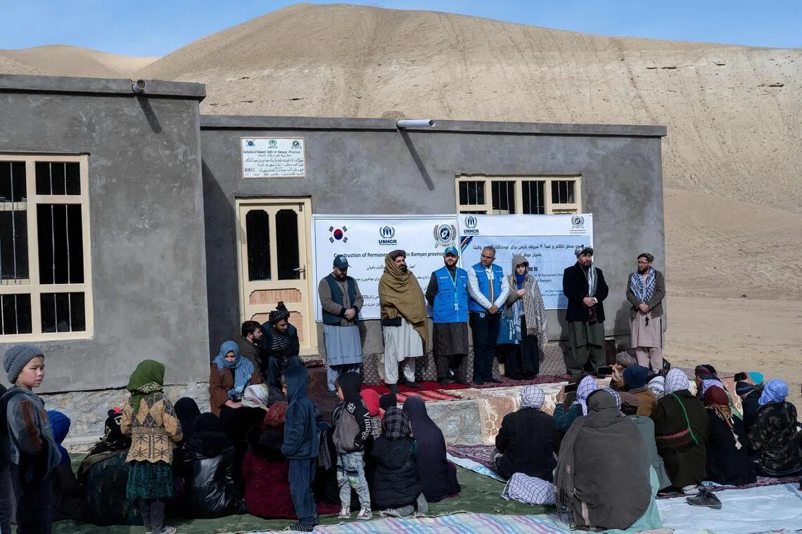 Afghan families attending a handover ceremony for newly constructed houses after they returned from Iran and Pakistan in Jar-e-Khushk on the outskirts of Bamiyan province.