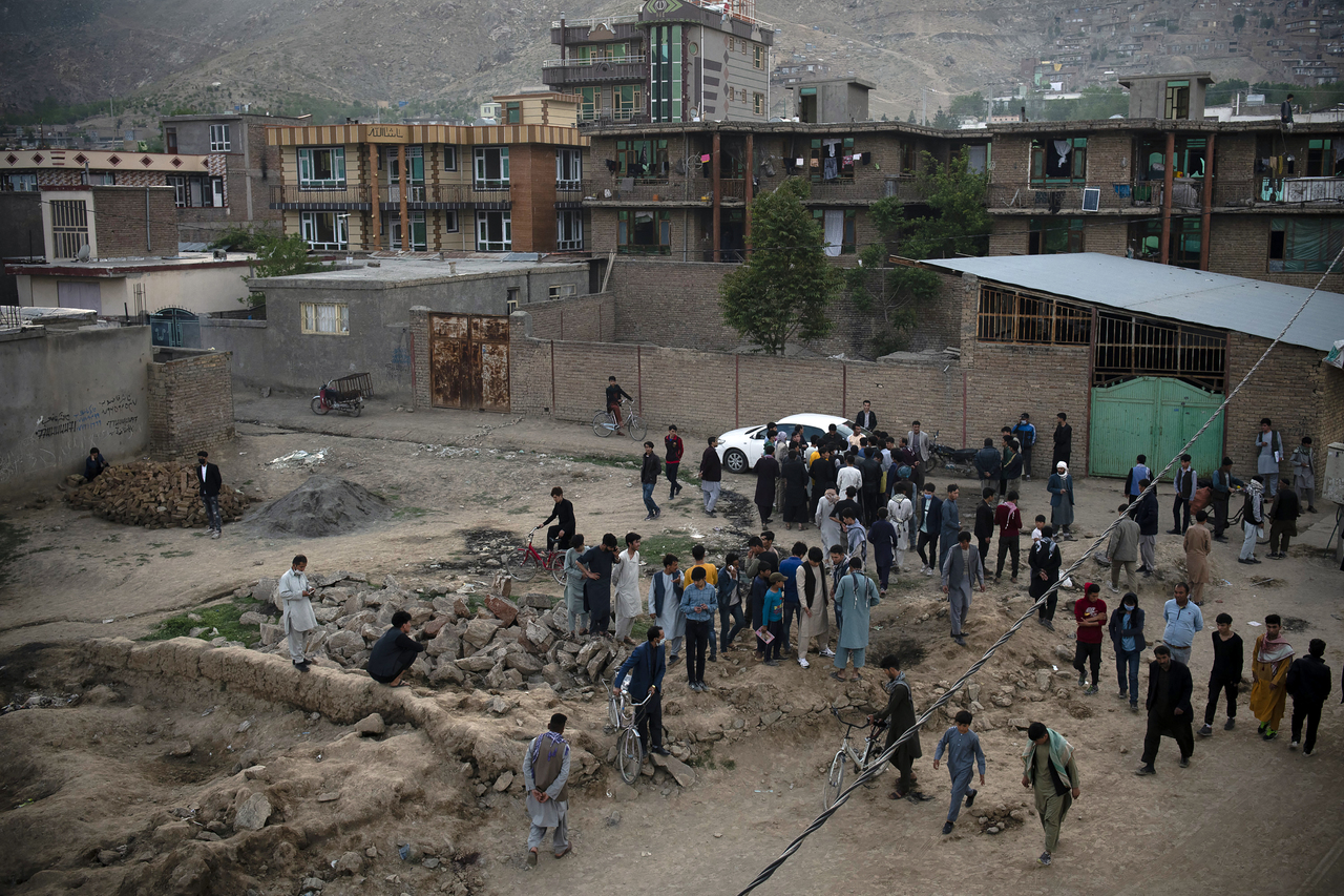 People gather at the site of a blast not far from the entrance to Sayed Ul-Shuhada high school in Kabul, Afghanistan, on Saturday, May 8, 2021.