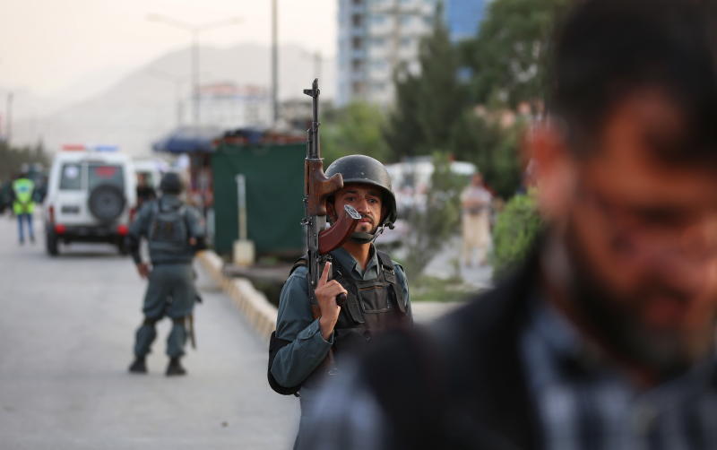 Afghan security forces cordon the area after multiple explosions targeted a political gathering where vice-presidential candidate Amrullah Saleh was also present in Kabul, Afghanistan, on July 28, 2019.