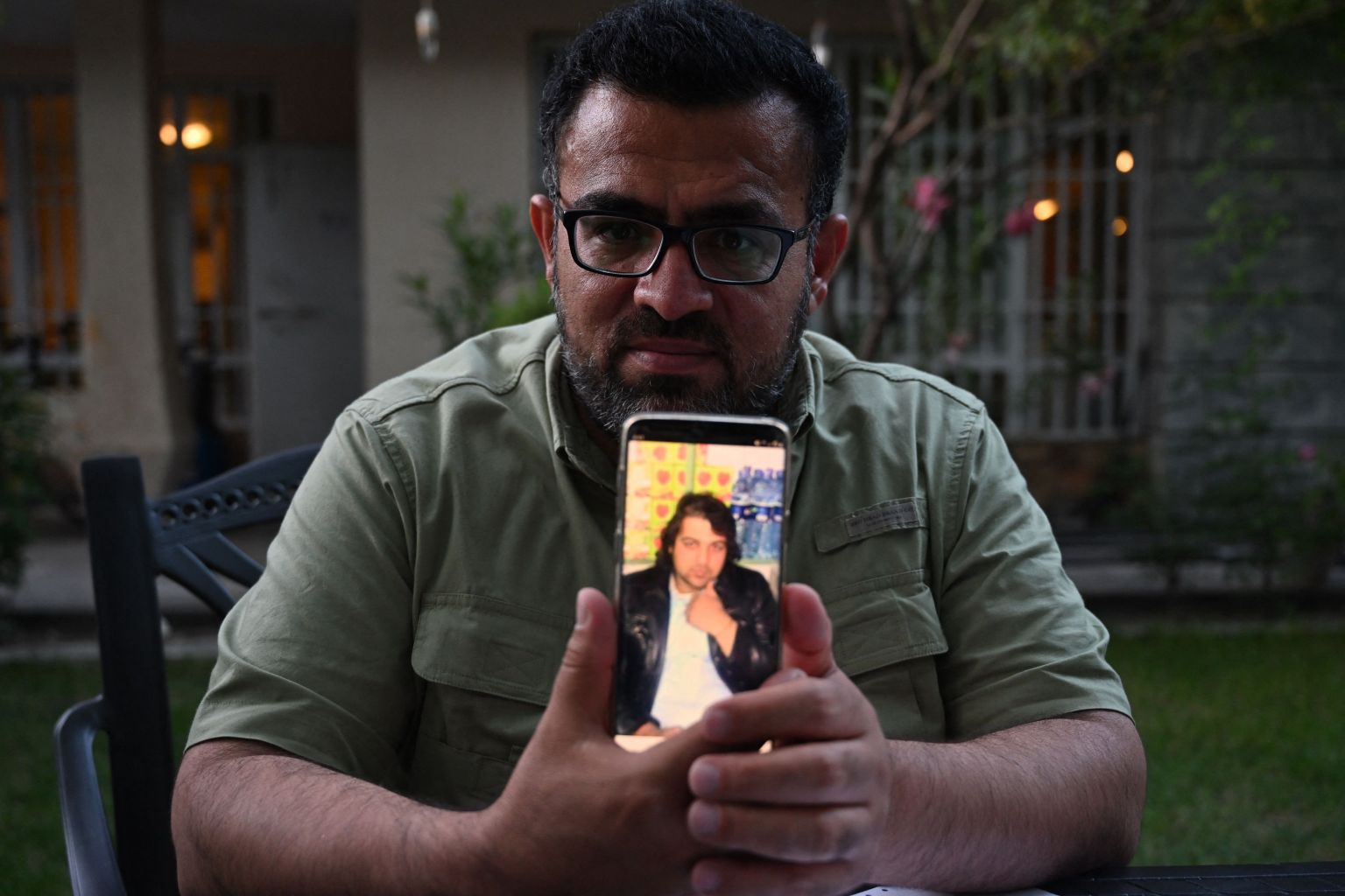 Ahmad Siyar Anwari, a former interpreter working for the French military, holds a phone with a picture of Abdul Basir.