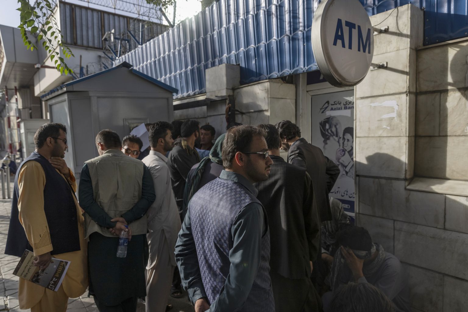 People wait in line to use an ATM machine at an Azizi Bank branch in Kabul, Afghanistan on Aug. 25, 2021.