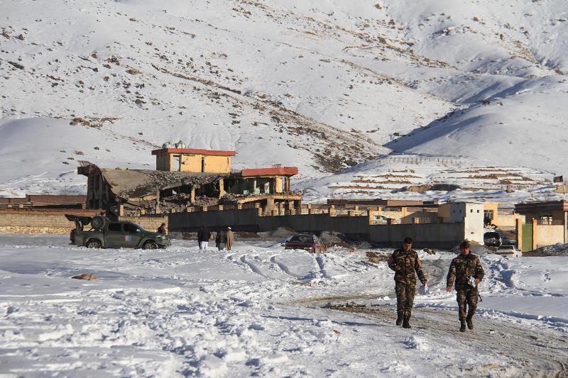 Afghan security forces walk near a site after a car bomb attack on a military base in the central province of Maidan Wardak on Jan 21, 2019.