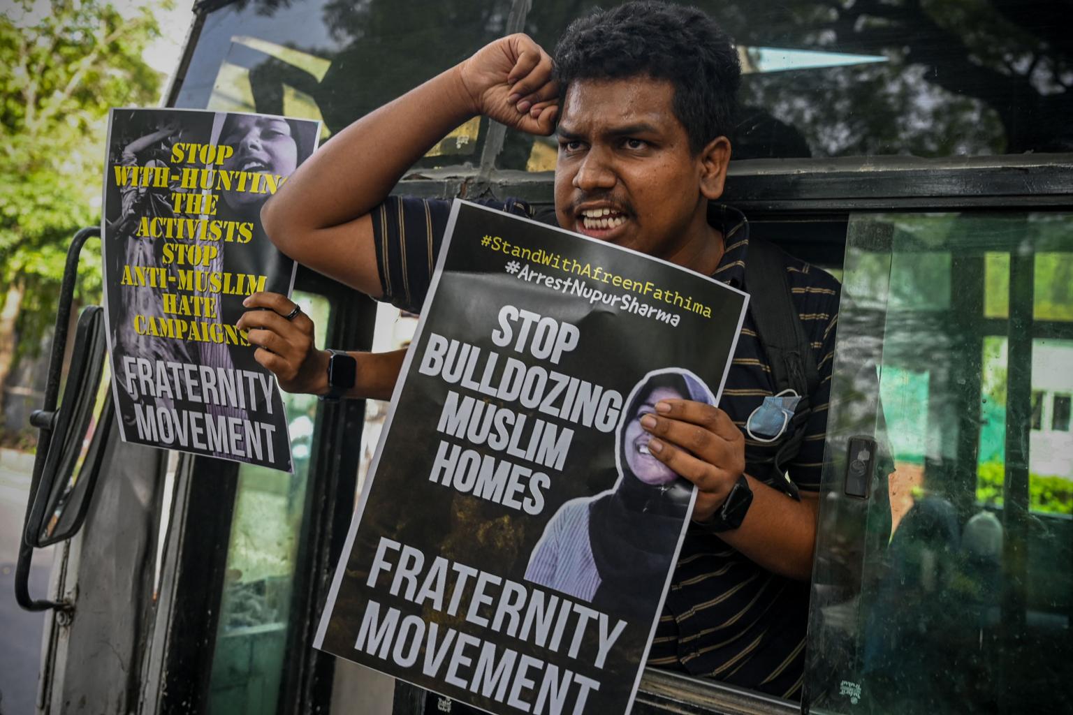 A student detained by police during a protest against the demolition of a Muslim leader's home in Allahabad on June 13, 2022.