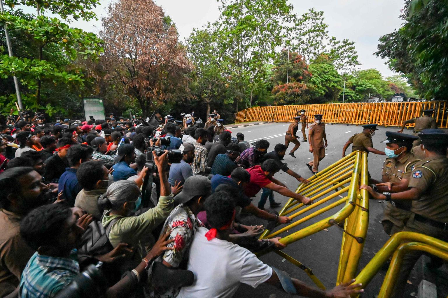 University students break police barrier during a demonstration near the parliament building in Colombo, on May 5, 2022.