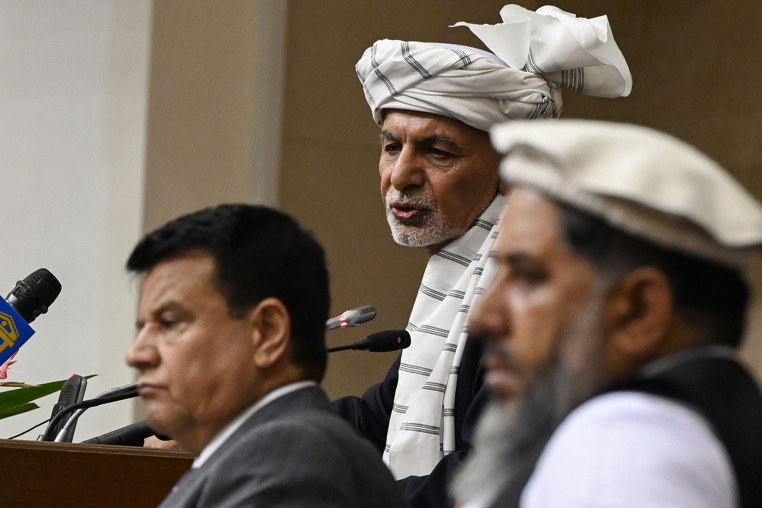 <p>Afghanistan's President Ashraf Ghani (C) speaks during a meeting at the Afghan Parliament house in Kabul on August 2, 2021. (Photo by WAKIL KOHSAR / AFP)</p>