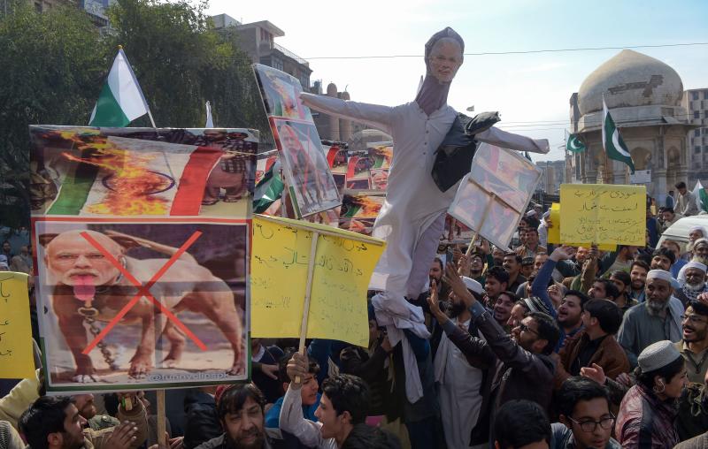 Pakistani protesters shout slogans and carry an effigy of Indian Prime Minister Narendra Modi during a demonstration in Peshawar on Feb 25, 2019.