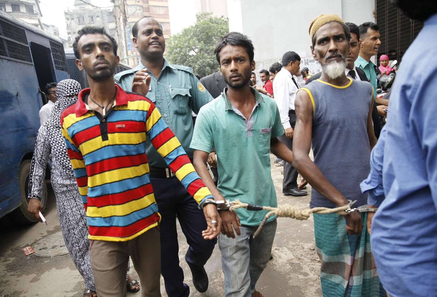Bangladeshi police escort arrested men in Dhaka on June 12, 2016, who were detained during a nationwide anti-militant crackdown.