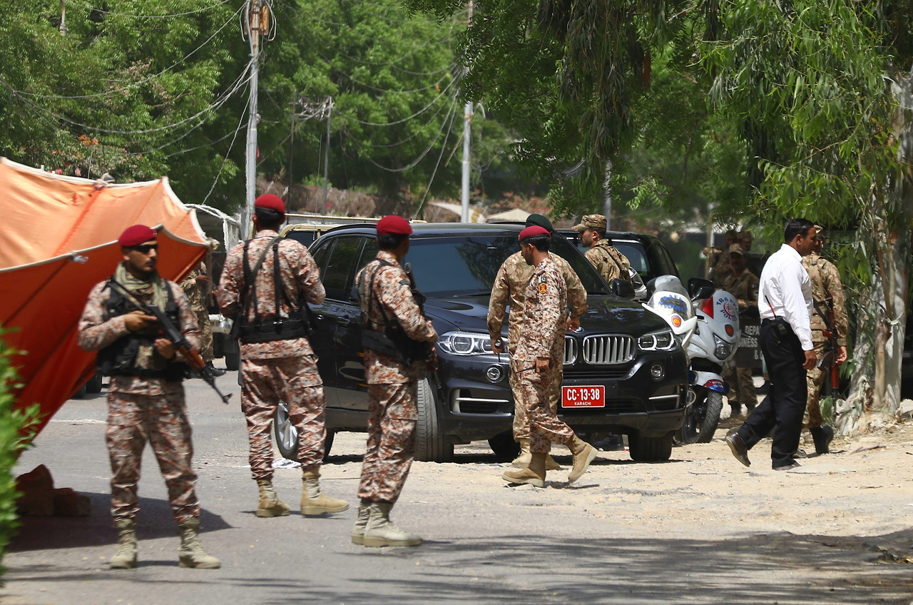 Pakistani security officials stand guard at the scene of a suicide bomb blast that targeted Chinese nationals, in Karachi, Pakistan, on April 27, 2022.