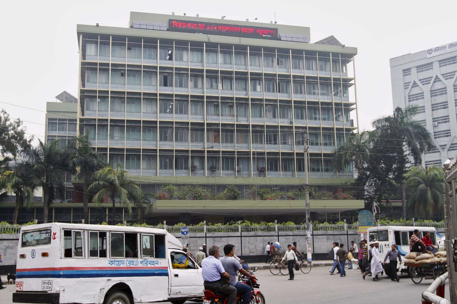 Commuters passing by in front of the Bangladesh central bank building in Dhaka.