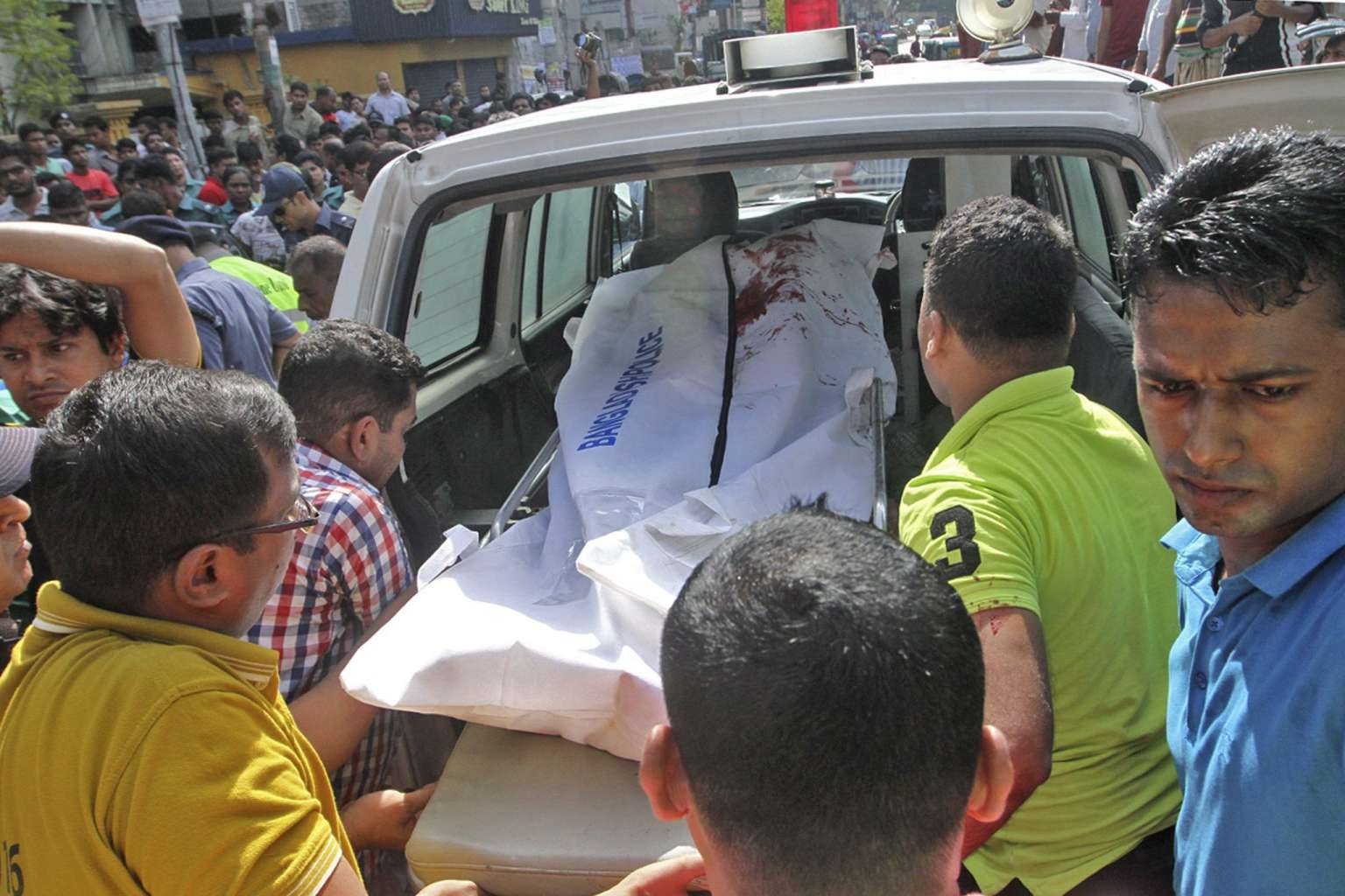 Bangladesh's police officers carry the body of Mahmuda Aktar, in Chittagong, Bangladesh, on June 5, 2016.
