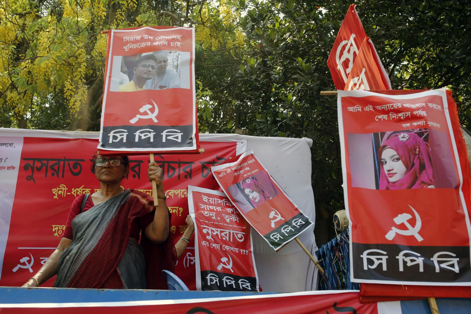 Activists hold posters demanding justice for Nusrat Jahan Rafi, who died in hospital on April 10, five days after she was attacked at the Sonagazi Islamia Madrasa.