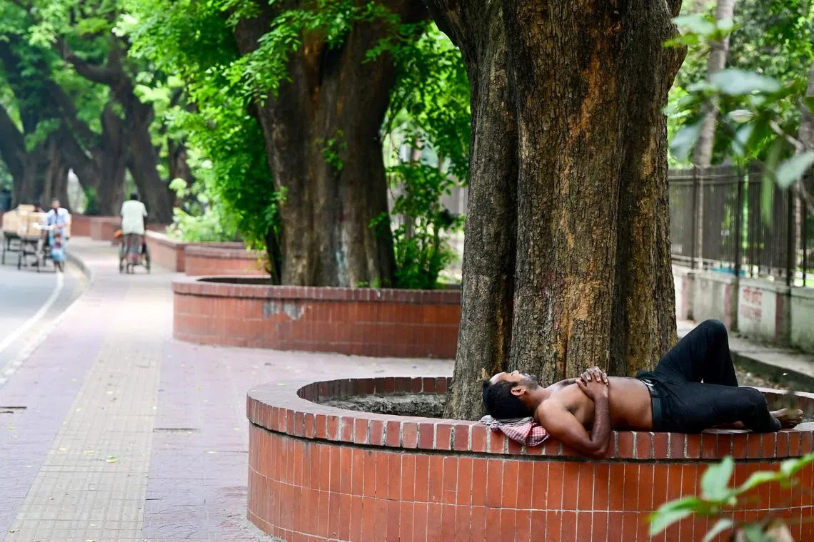 A man resting in the shade of a tree amid a severe heatwave in Dhaka on April 25, 2024.