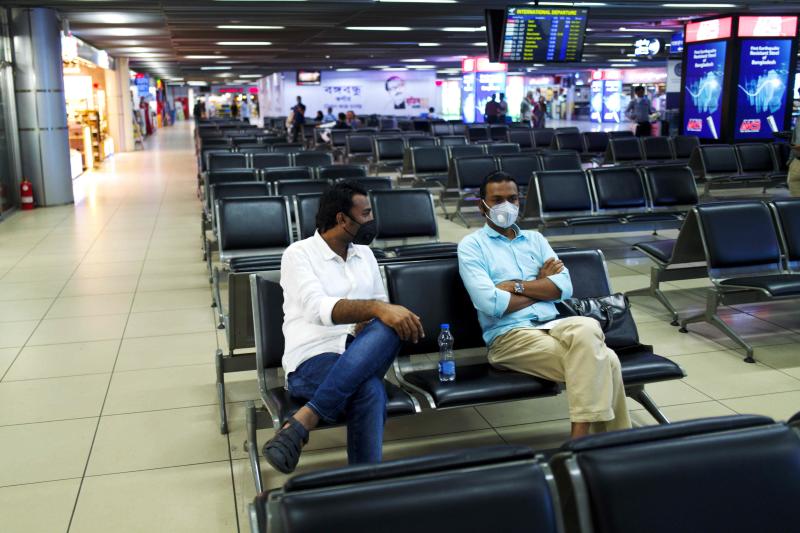 Passengers wearing face masks as a preventive measure against the spread of the coronavirus outbreak, wait to board their plane at Hazrat Shahjalal International Airport in Dhaka on March 8, 2020.