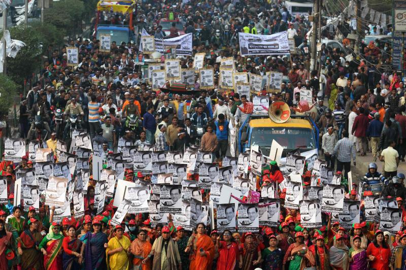 Supporters of Bangladesh Awami League march along a street as they take part in a rally ahead of the Dec 30 general election vote, in Dhaka on Dec 27, 2018.