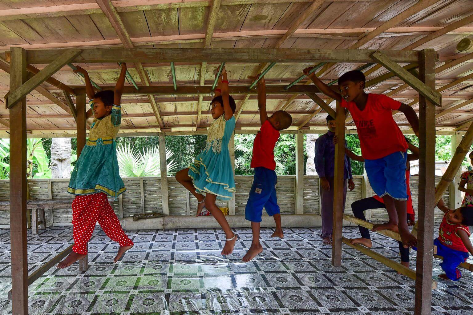 Children playing inside a "floating playboat" operated by the Shidhulai Swanirvar Sangstha charity in Chalan Beel in Rajshahi district, Bangladesh, on Sept 4, 2018.