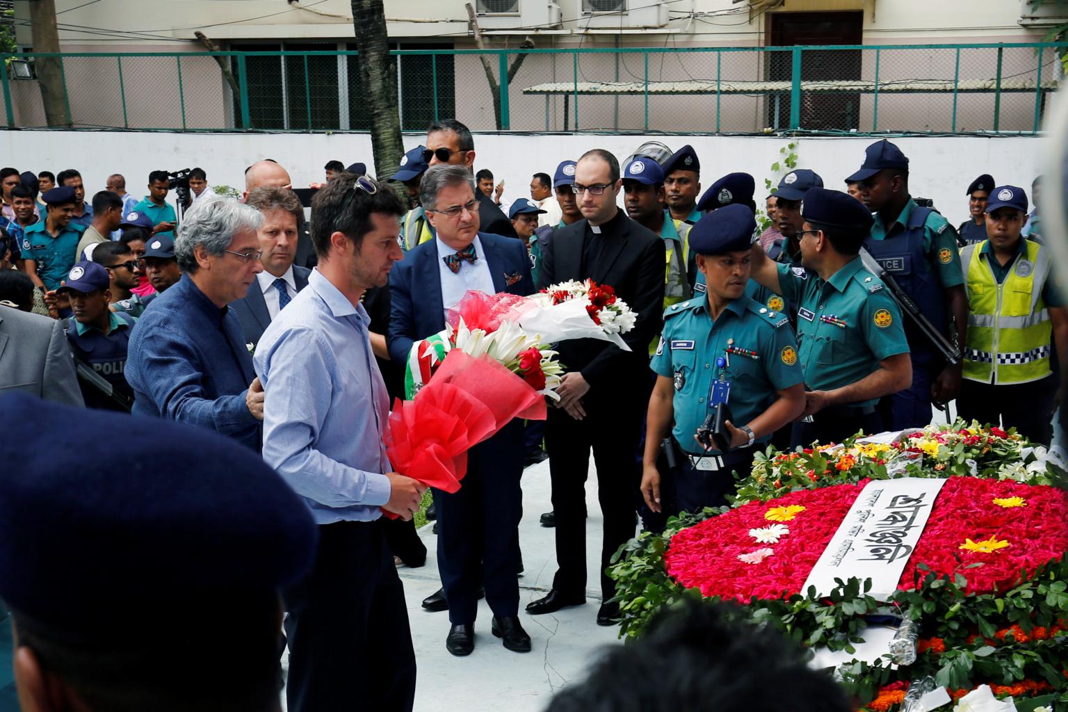Amid heavy police security, the two-storey white-painted house was opened up for four hours on Saturday, as top political leaders, the Italian and Japanese ambassadors, and scores of tearful mourners paid tribute to the victims of the siege.