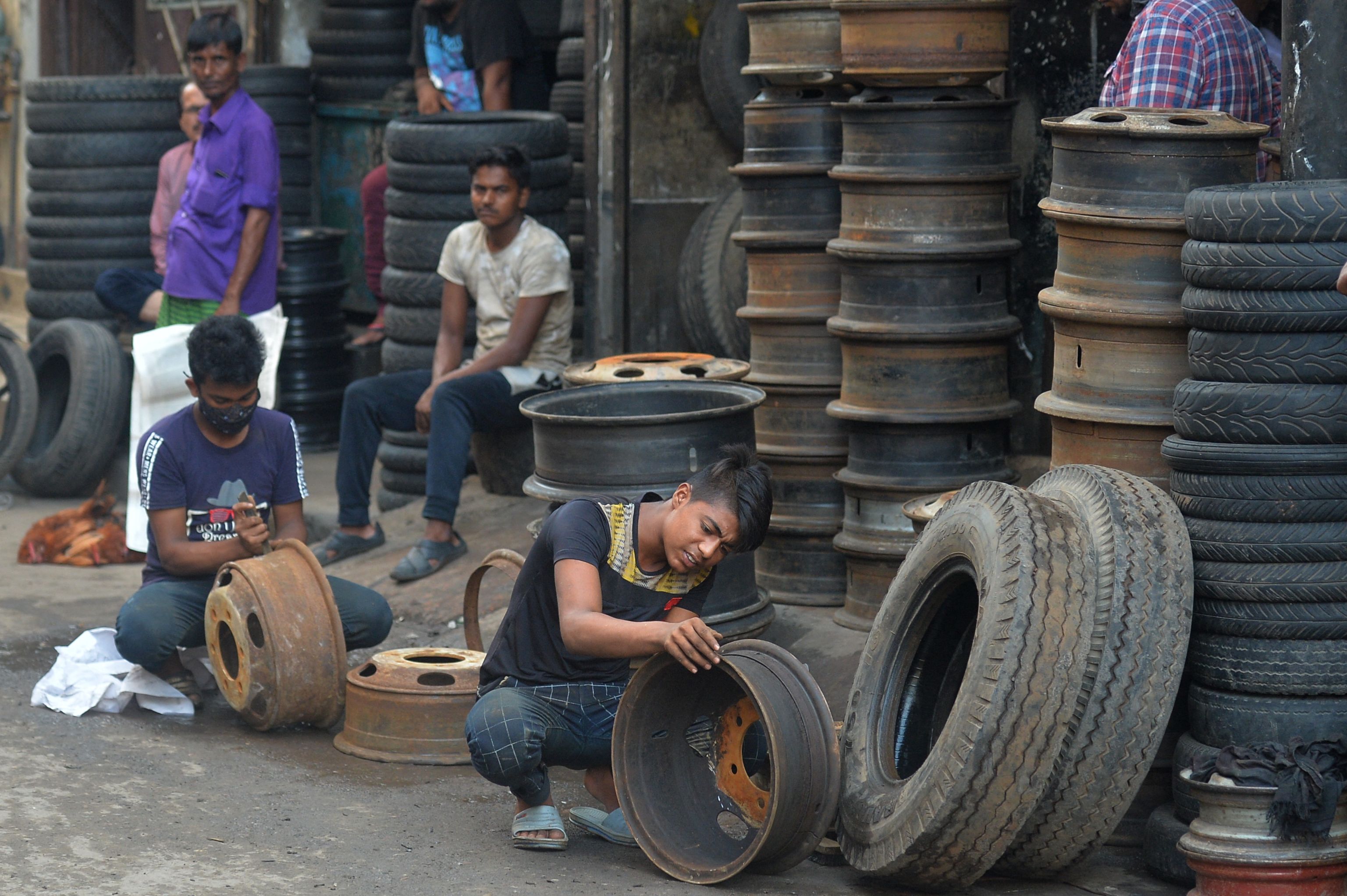 A youth cleans rusts from a car wheels at a workshop in Dhaka on June 8, 2021.
