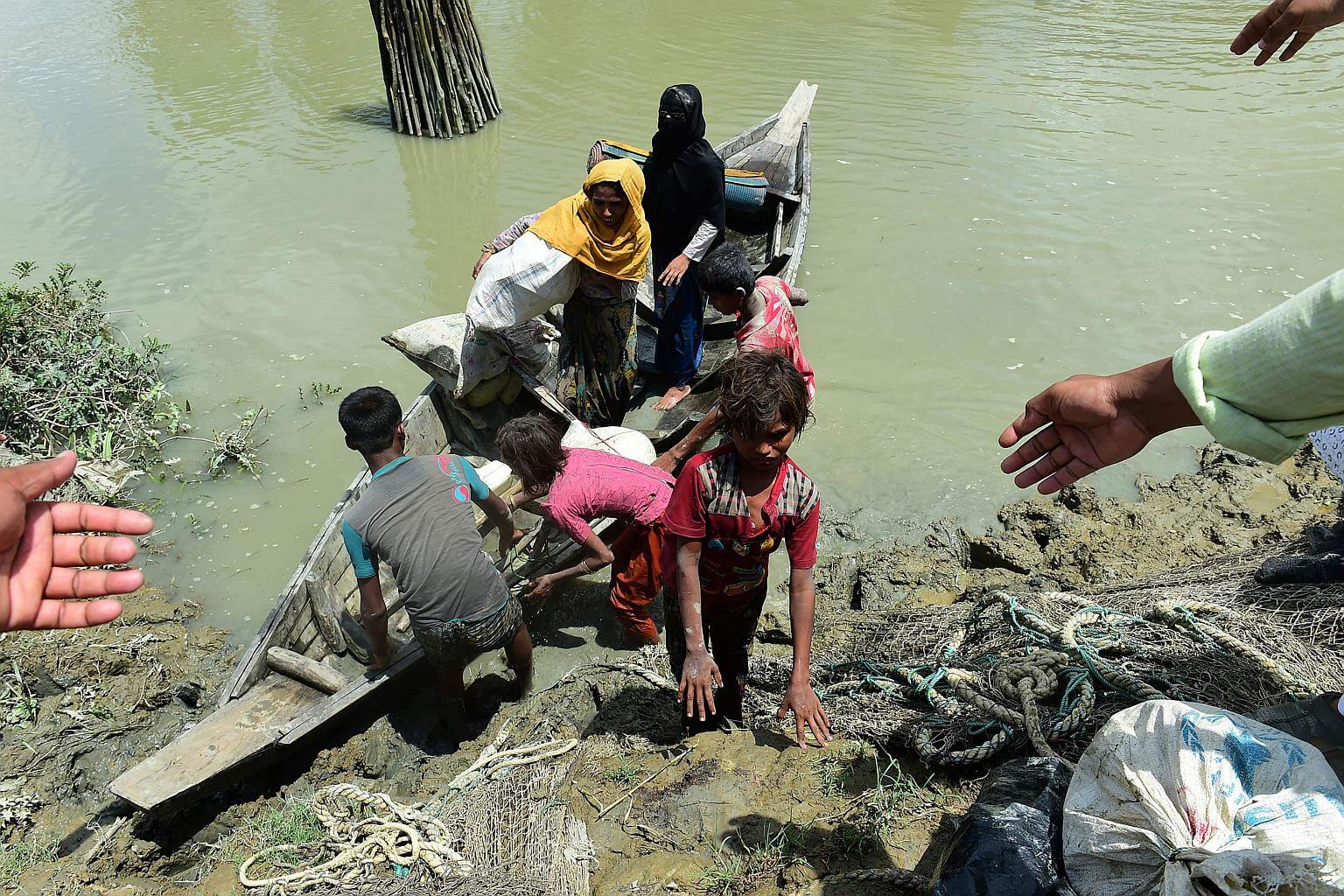 Local Bangladeshis help Rohingya Muslim refugees to disembark from a boat on the Bangladeshi side of Naf river near the Bangladeshi town of Teknaf on Sept 11, 2017.