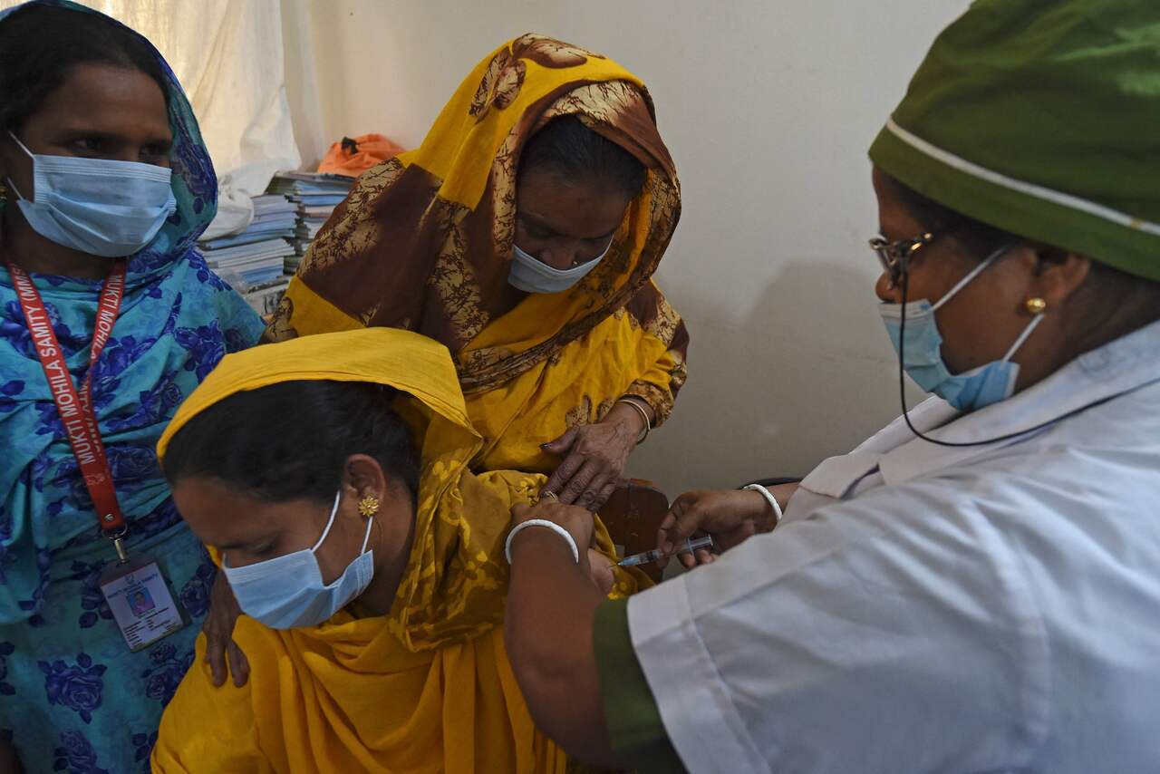 A health worker inoculates sex workers from the country's largest brothel with the Covid-19 coronavirus vaccine in Daulatdia on March 3, 2021.