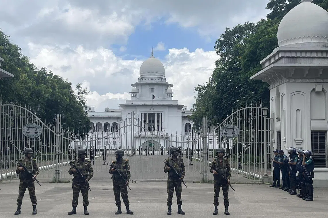 Soldiers standing guard outside the Supreme Court in Dhaka on July 21.